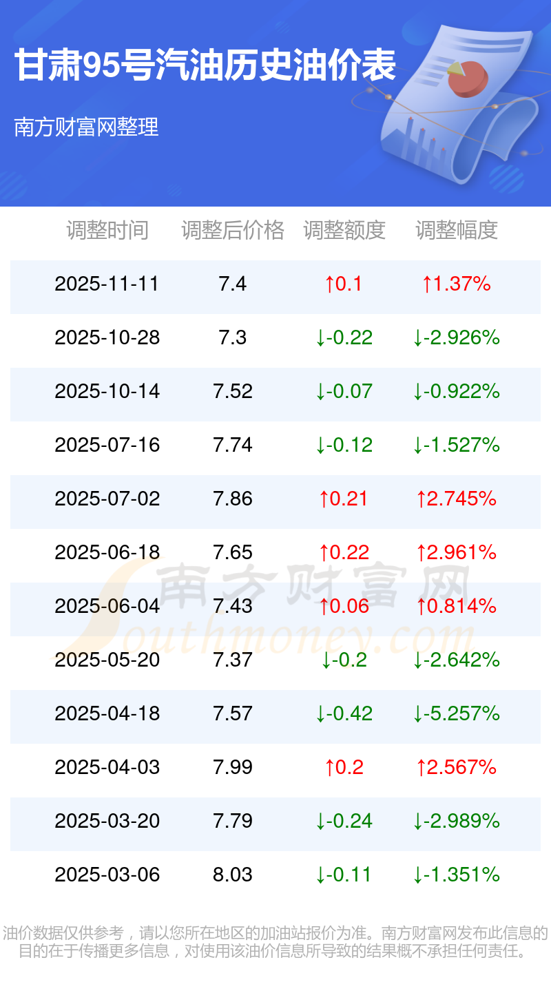 11月13日,甘肅95號(hào)汽油的價(jià)格是7.4元每升,本次的調(diào)整時(shí)間為11月11日,對(duì)比上次的調(diào)整升了0.1元,升1.37%,下次調(diào)整時(shí)間為11月24日24時(shí),還有11.45天。
