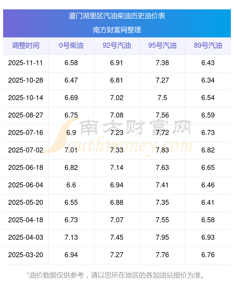2025年廈門湖里區(qū)汽油價(jià)格一覽表