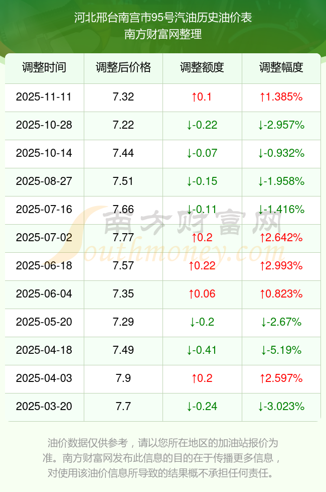 11月13日河北邢臺南宮市95號汽油歷史油價一覽表