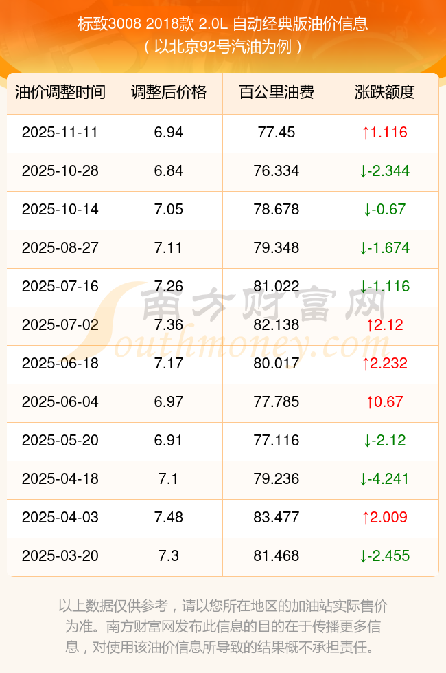 按照11月11日92號(hào)汽油最新調(diào)整價(jià)格6.94元/升來(lái)計(jì)算(以北京為例),該車型百公里平均油費(fèi)為77.45元,按照上一輪10月28日調(diào)整價(jià)格6.84元/升來(lái)計(jì)算,百公里平均油費(fèi)為76.334元,對(duì)比上一輪多花1.116元,下一輪油價(jià)調(diào)整時(shí)間為11月24日24時(shí)。