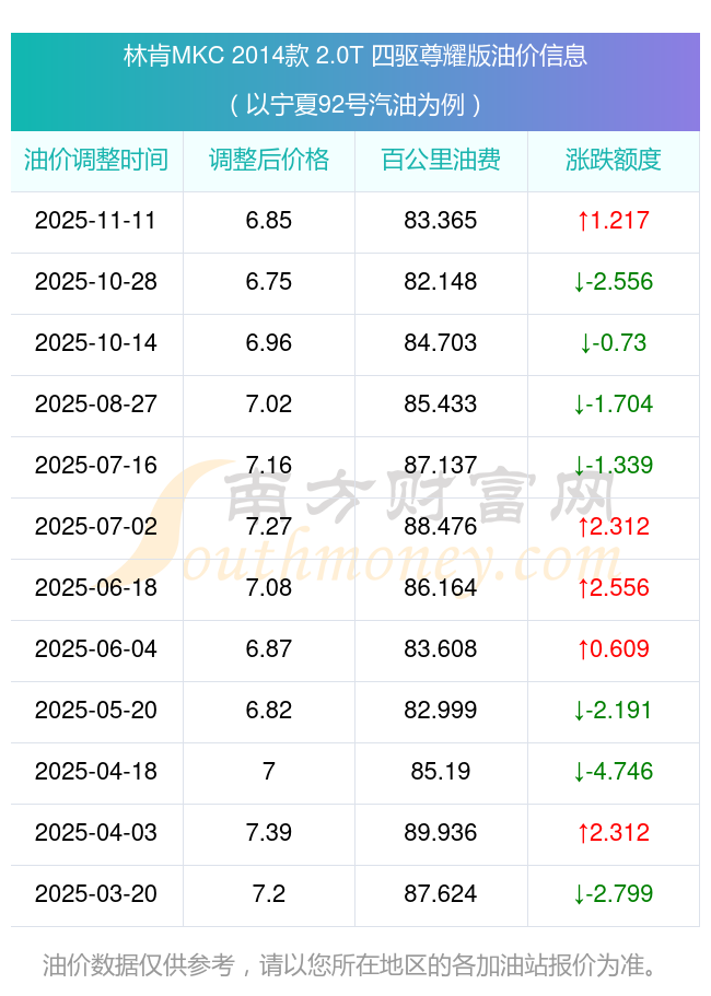 根據(jù)11月11日92號(hào)汽油最新調(diào)整價(jià)格6.85元/升來計(jì)算(以寧夏為例),該車型每百公里的平均油費(fèi)是83.365元,上一輪10月28日調(diào)整價(jià)格6.75元每升來計(jì)算,每百公里的平均油費(fèi)是82.148元,對(duì)比上一輪多花1.217元,下一輪的油價(jià)調(diào)整時(shí)間是11月24日24時(shí)。