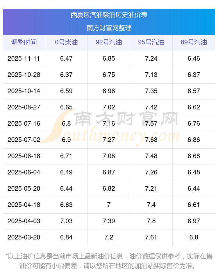 11月13日,西夏區(qū)汽油、柴油每升的價(jià)格為11月11日調(diào)整后的價(jià)格,具體為:92號汽油為6.85元,上升了0.1元,上升幅達(dá)1.48%;95號汽油為7.24元,上升了0.11元,上升幅達(dá)1.54%;89號汽油為6.46元,上升了0.09元,上升幅達(dá)1.41%;0號柴油為6.47元,上升了0.1元,上升幅達(dá)1.57%。