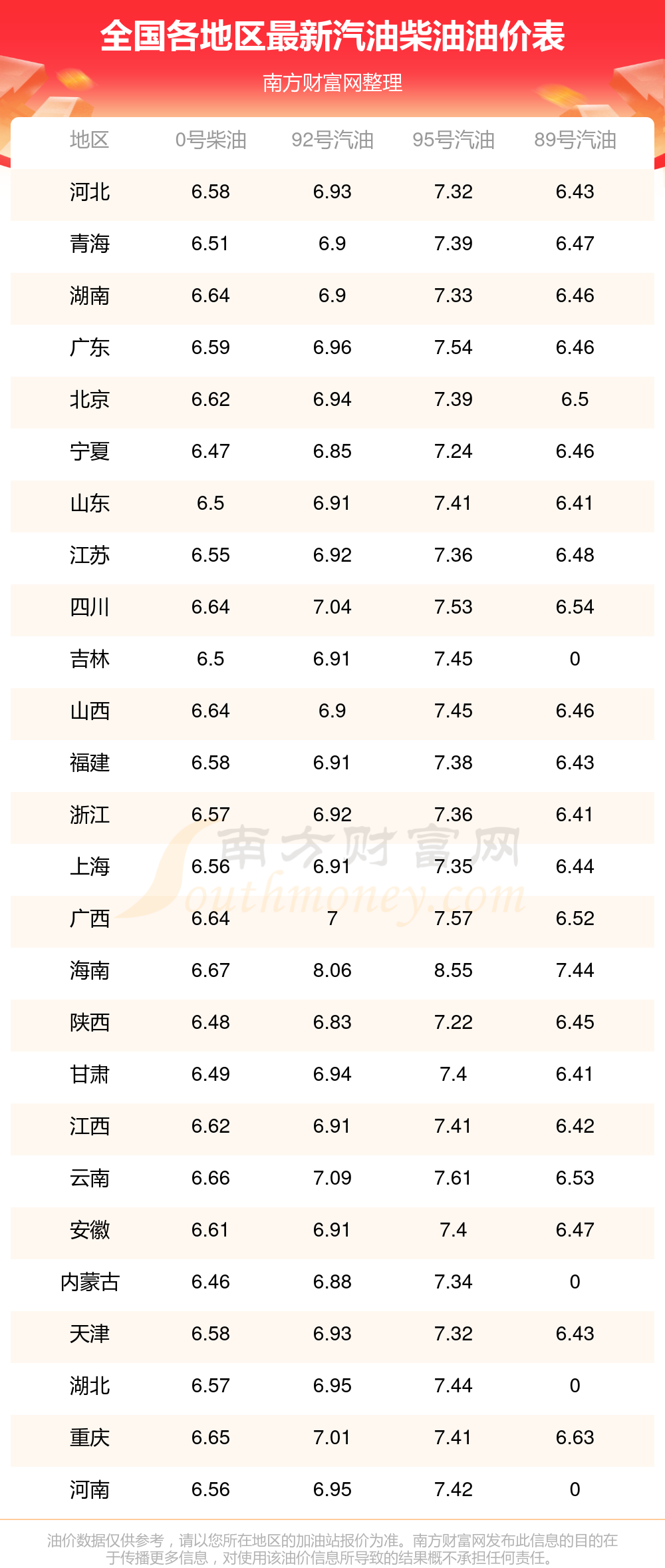 這一輪油價調(diào)整的時間是11月11日,調(diào)整后全國油價的具體價格為:92號汽油平均價格為7元每升,其中,最低的是陜西,6.83元每升,最高的是海南,8.06元每升。95號汽油平均價格為7元每升,其中,最低的是陜西,7.22元每升,最高的是海南,8.55元每升。0號柴油平均價格為:7元每升,其中,最低的是內(nèi)蒙古,6.46元每升,最高的是海南,6.67元每升。89號汽油平均價格為7元每升,其中,最低的是浙江,6.41元每升,最高的是海南,7.44元每升。