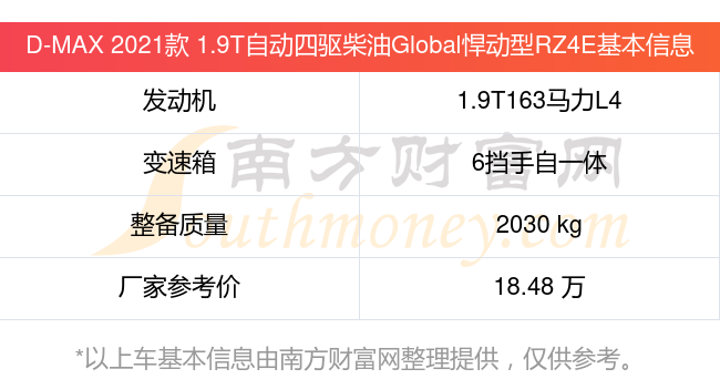 D-MAX 2021款 1.9T自動(dòng)四驅(qū)柴油Global悍動(dòng)型RZ4E動(dòng)力上配備的是一臺(tái)1.9T163馬力L4渦輪增壓發(fā)動(dòng)機(jī),匹配的是6擋手自一體自動(dòng)檔變速箱,燃料形式為柴油,常規(guī)整備質(zhì)量2030kg,廠家參考價(jià)18.48萬(wàn)元。