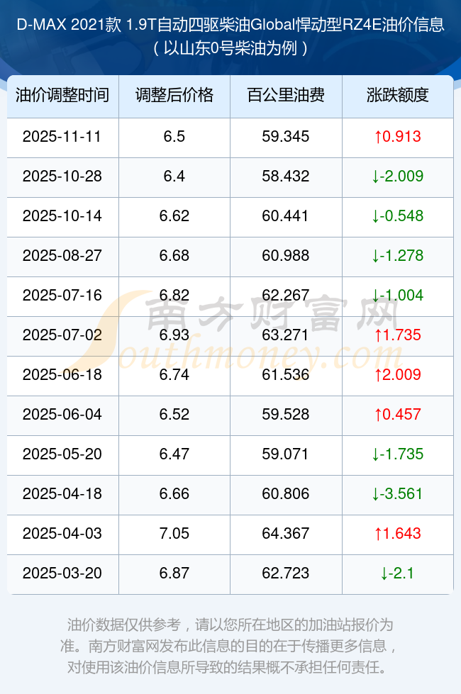 按照11月11日0號(hào)柴油最新調(diào)整價(jià)格6.5元/升來(lái)計(jì)算(以山東為例),該車型百公里平均油費(fèi)為59.345元,按照上一輪10月28日調(diào)整價(jià)格6.4元/升來(lái)計(jì)算,百公里平均油費(fèi)為58.432元,對(duì)比上一輪多花0.913元,下一輪油價(jià)調(diào)整時(shí)間為11月24日24時(shí)。