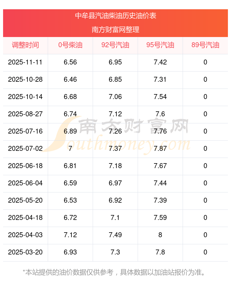 11月13日,中牟縣汽油、柴油每升最新價格為(11月11日調(diào)整后的價格):92號汽油為6.95元,升了0.1元,升幅達1.46%;95號汽油為7.42元,升了0.11元,升幅達1.51%;0號柴油為6.56元,升了0.1元,升幅達1.55%。