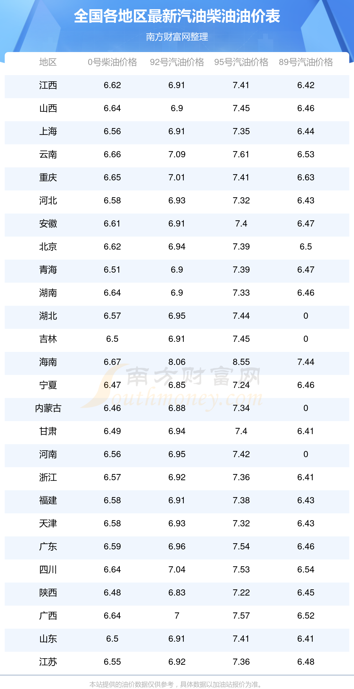 以上數(shù)據(jù)僅供參考,請以您所在地區(qū)的加油站實際售價為準(zhǔn)。南方財富網(wǎng)發(fā)布此信息的目的在于傳播更多信息,對使用該油價信息所導(dǎo)致的結(jié)果概不承擔(dān)責(zé)任。