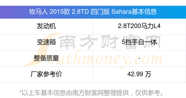 牧馬人 2015款 2.8TD 四門版 Sahara搭載了一臺2.8T200馬力L4渦輪增壓發(fā)動機,采用5擋手自一體自動檔變速箱,廠家參考價42.99萬元。