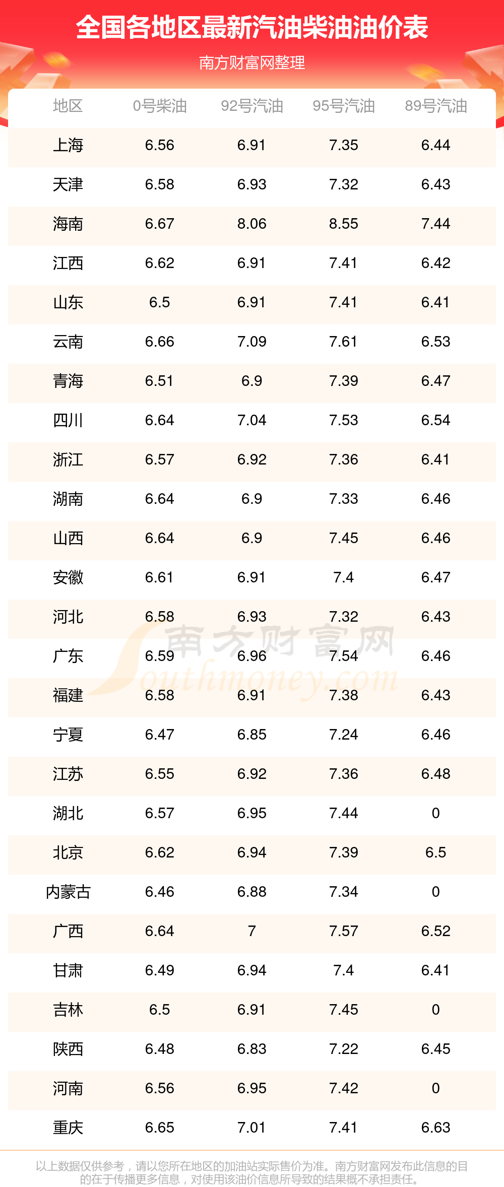 油價數(shù)據(jù)僅供參考,請以您所在地區(qū)的各加油站報價為準(zhǔn)。