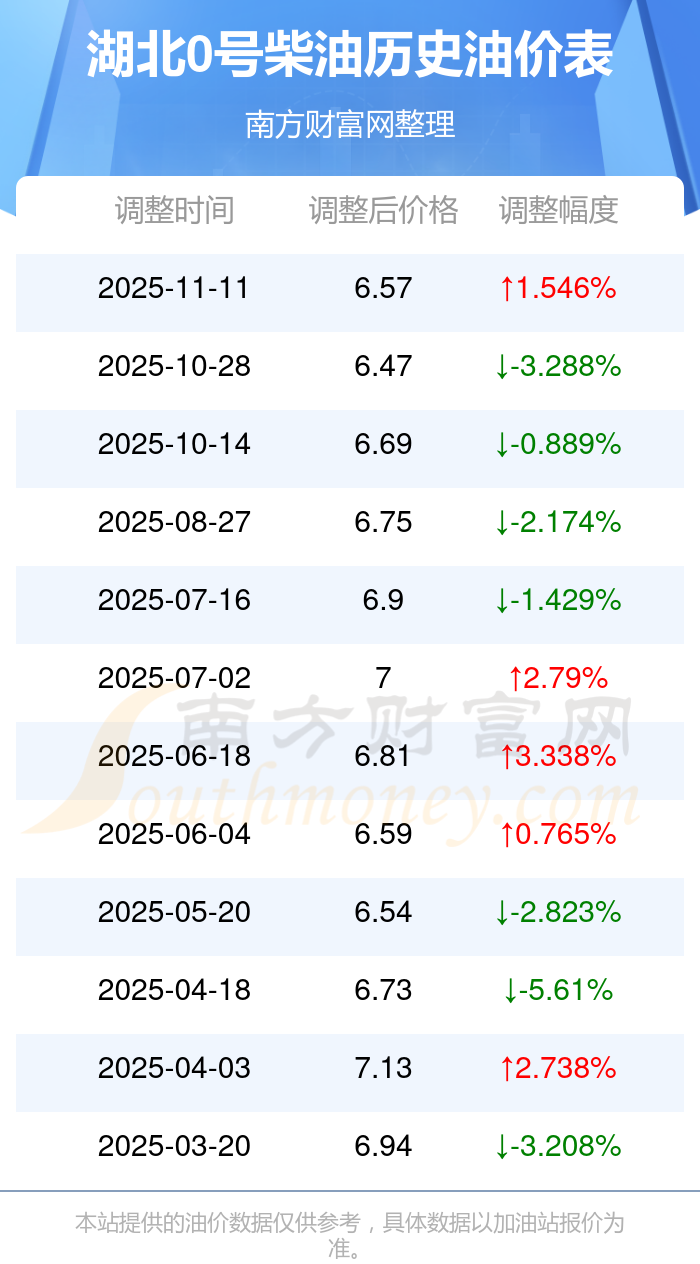 11月13日湖北0號柴油的價格是6.57元/升,油價調(diào)整時間是11月11日,對比上一次油價調(diào)整共增了0.1元。