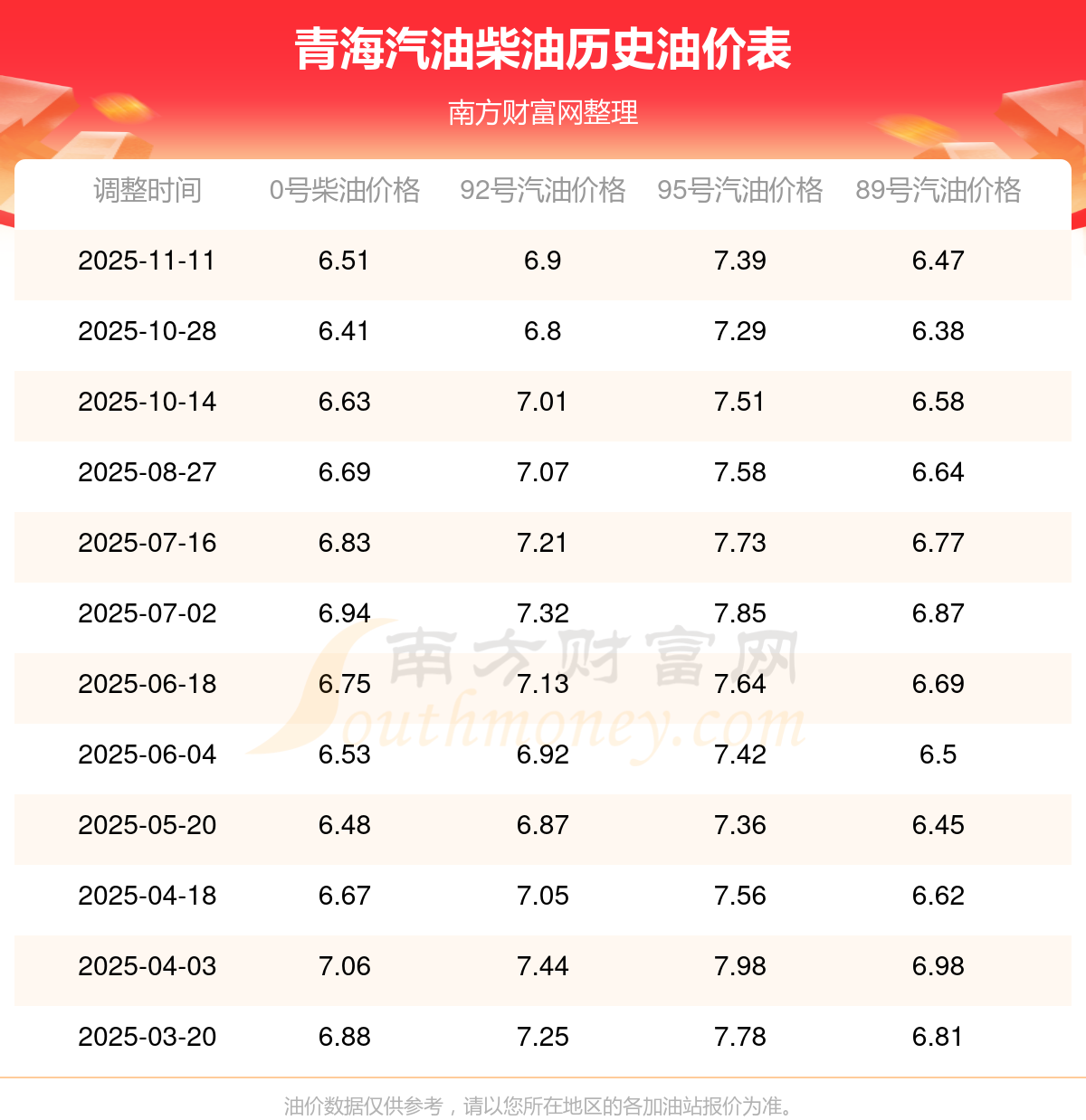 11月13日,青海95號汽油的價格是7.39元每升,本次的調(diào)整時間為11月11日,對比上次的調(diào)整升了0.1元,升1.372%,下次調(diào)整時間為11月24日24時,還有11.37天。