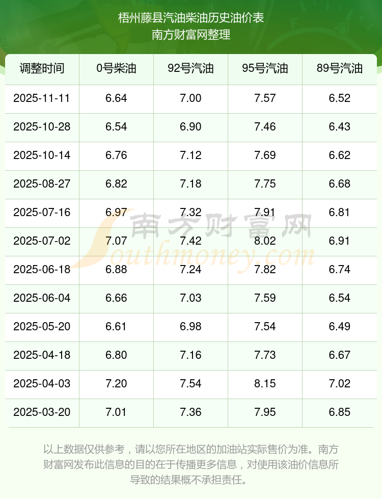 11月13日梧州藤縣汽油、柴油每升價格詳情為:92號汽油為7元,上漲了0.1元;95號汽油為7.57元,上漲了0.11元;89號汽油為6.52元,上漲了0.09元;0號柴油為6.64元,上漲了0.1元,本次油價調整時間為11月11日。