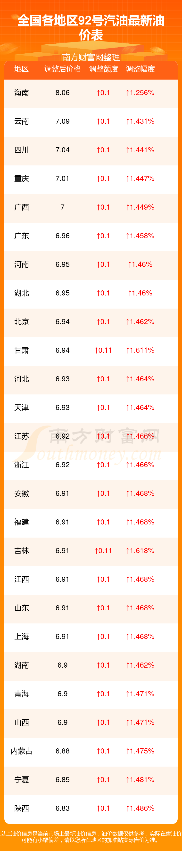 全國(guó)各地區(qū)最新92號(hào)汽油油價(jià)表