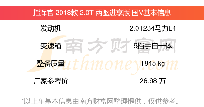 指揮官 2018款 2.0T 兩驅(qū)進享版 國V動力方面,搭載的是一臺2.0T234馬力L4渦輪增壓發(fā)動機,匹配9擋手自一體自動檔變速箱,燃料形式為汽油,常規(guī)整備質(zhì)量1845kg,廠家參考價26.98萬元。