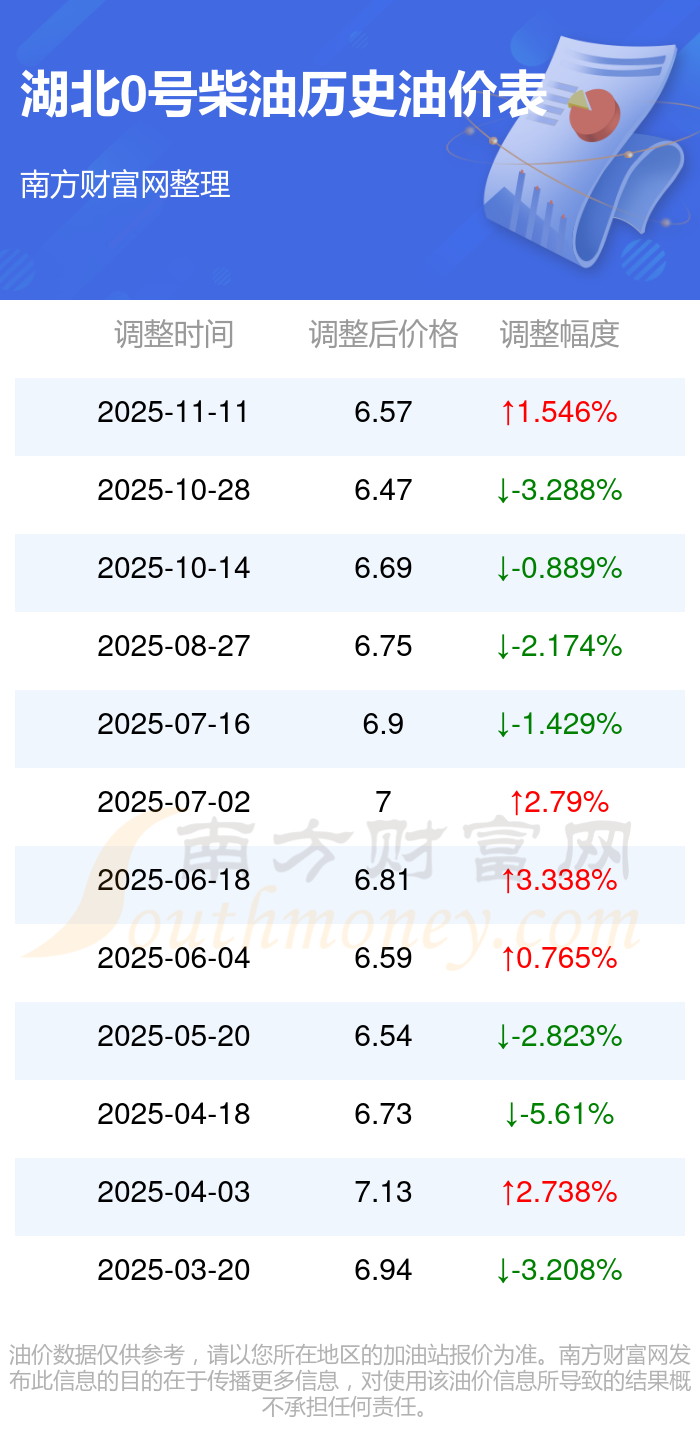 11月13日,湖北0號(hào)柴油的價(jià)格是6.57元每升,本次的調(diào)整時(shí)間為11月11日,對(duì)比上次的調(diào)整漲了0.1元,漲1.546%,下次調(diào)整時(shí)間為11月24日24時(shí),還有11.35天。