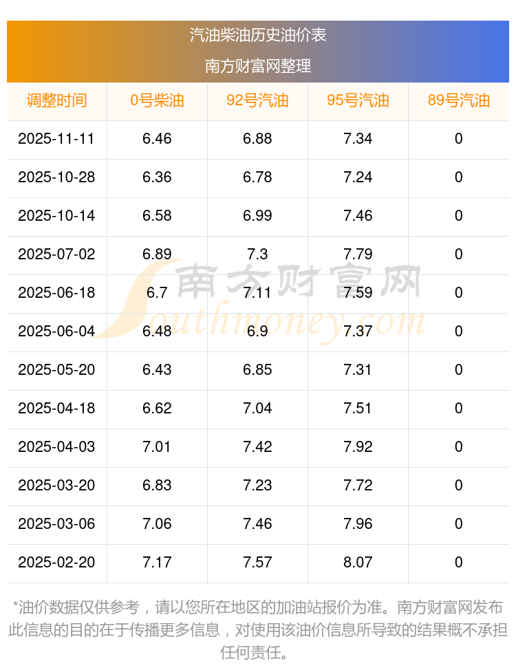 11月13日,內蒙古烏蘭察布汽油、柴油每升最新價格為:92號汽油為6.88元,上漲了0.1元;95號汽油為7.34元,上漲了0.1元;0號柴油為6.46元,上漲了0.1元,調整時間為11月11日。下一輪油價調整時間11月24日24時,距離現在還有11.35天。