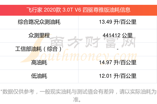 根據(jù)多位車主實測得出數(shù)據(jù),該車型低油耗為12.01L/100km,高油耗為14.97L/100km,綜合路況眾測油耗為13.49L/100km,工信部綜合油耗為-L/100km。