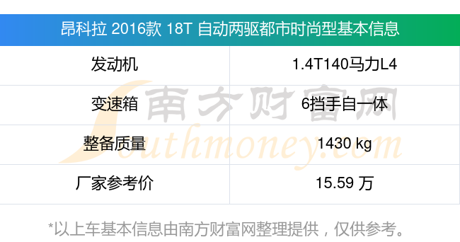 昂科拉 2016款 18T 自動兩驅(qū)都市時(shí)尚型動力上配備的是一臺1.4T140馬力L4渦輪增壓發(fā)動機(jī),匹配的是6擋手自一體自動檔變速箱,燃料形式為汽油,常規(guī)整備質(zhì)量1430kg,廠家參考價(jià)15.59萬元。