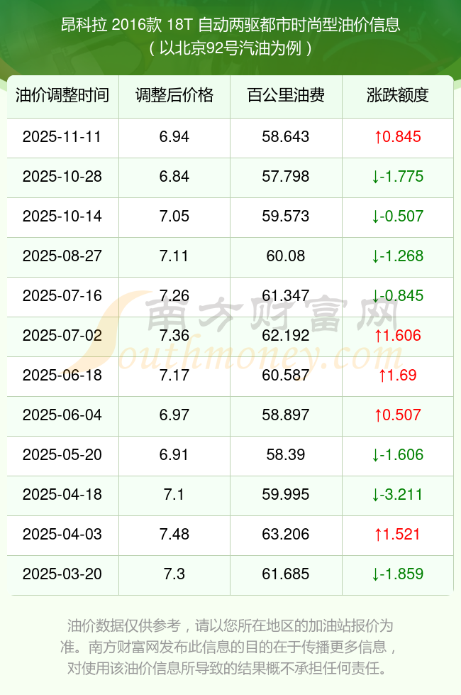 按照11月11日92號汽油最新調(diào)整價(jià)格6.94元/升來計(jì)算(以北京為例),該車型百公里平均油費(fèi)為58.643元,按照上一輪10月28日調(diào)整價(jià)格6.84元/升來計(jì)算,百公里平均油費(fèi)為57.798元,對比上一輪多花0.845元,下一輪油價(jià)調(diào)整時(shí)間為11月24日24時(shí)。
