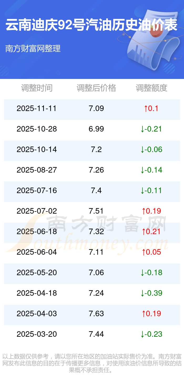 2025年92號(hào)汽油價(jià)格調(diào)整一覽表