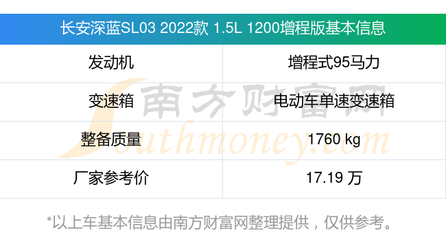 長安深藍(lán)SL03 2022款 1.5L 1200增程版動力方面,搭載的是一臺增程式95馬力自然吸氣發(fā)動機,匹配電動車單速變速箱自動檔變速箱,燃料形式為增程式,常規(guī)整備質(zhì)量1760kg,廠家參考價17.19萬元。