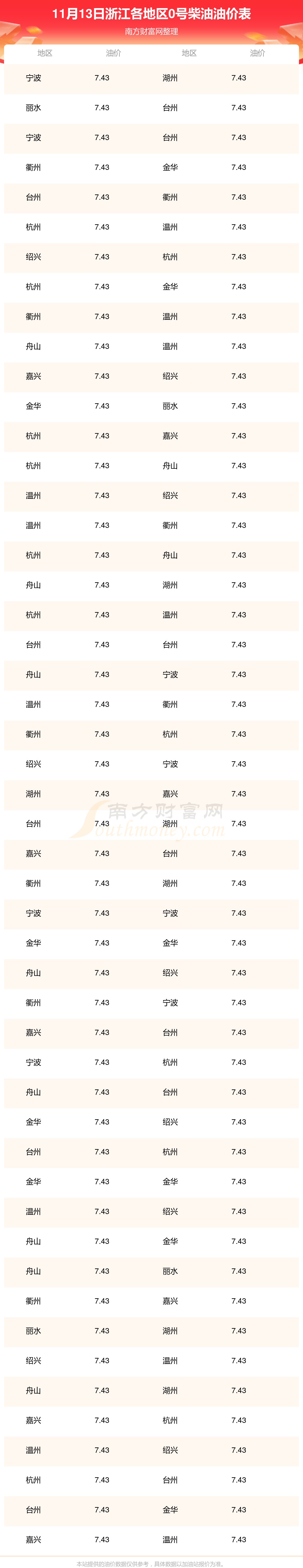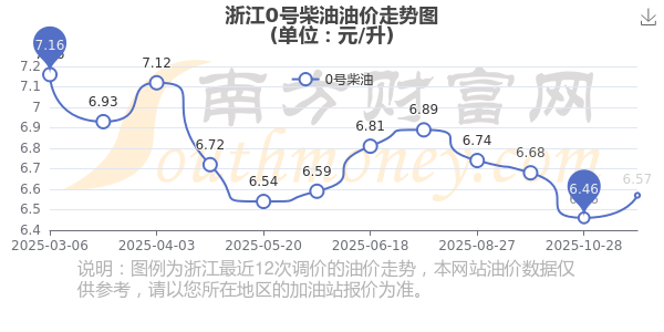 11月13日浙江0號柴油最新價格是6.57元每升,調(diào)整時間為11月11日,相對上次調(diào)整上升了0.11元,上升1.703%。