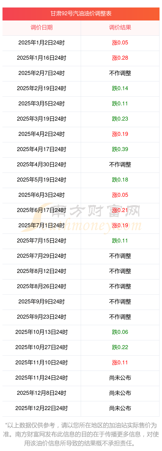 甘肅天水2025年油價調(diào)整時間及最新價格表