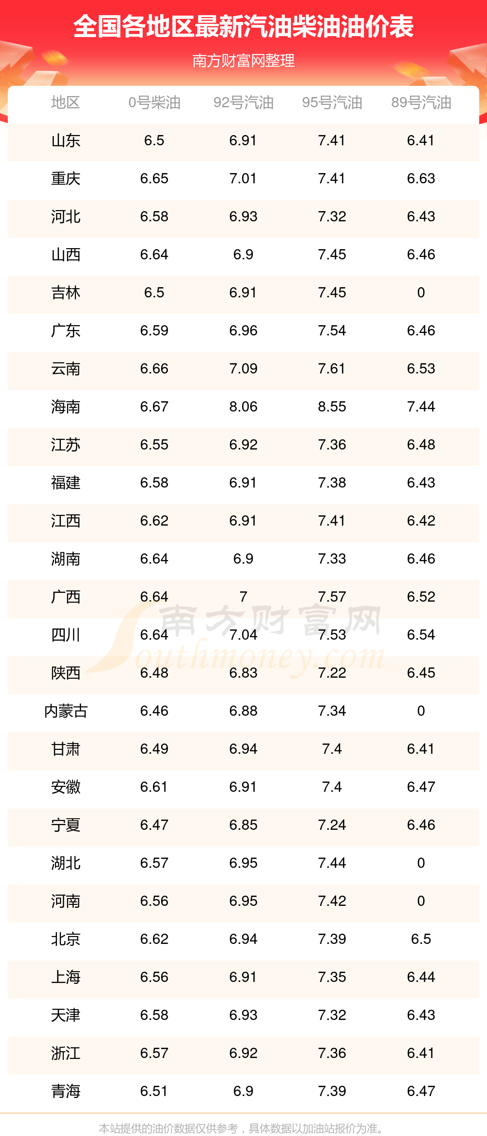 全國0號柴油平均價格為:7元每升,其中,最低為內蒙古,價格6.46元/升,最高為海南,價格6.67元/升。