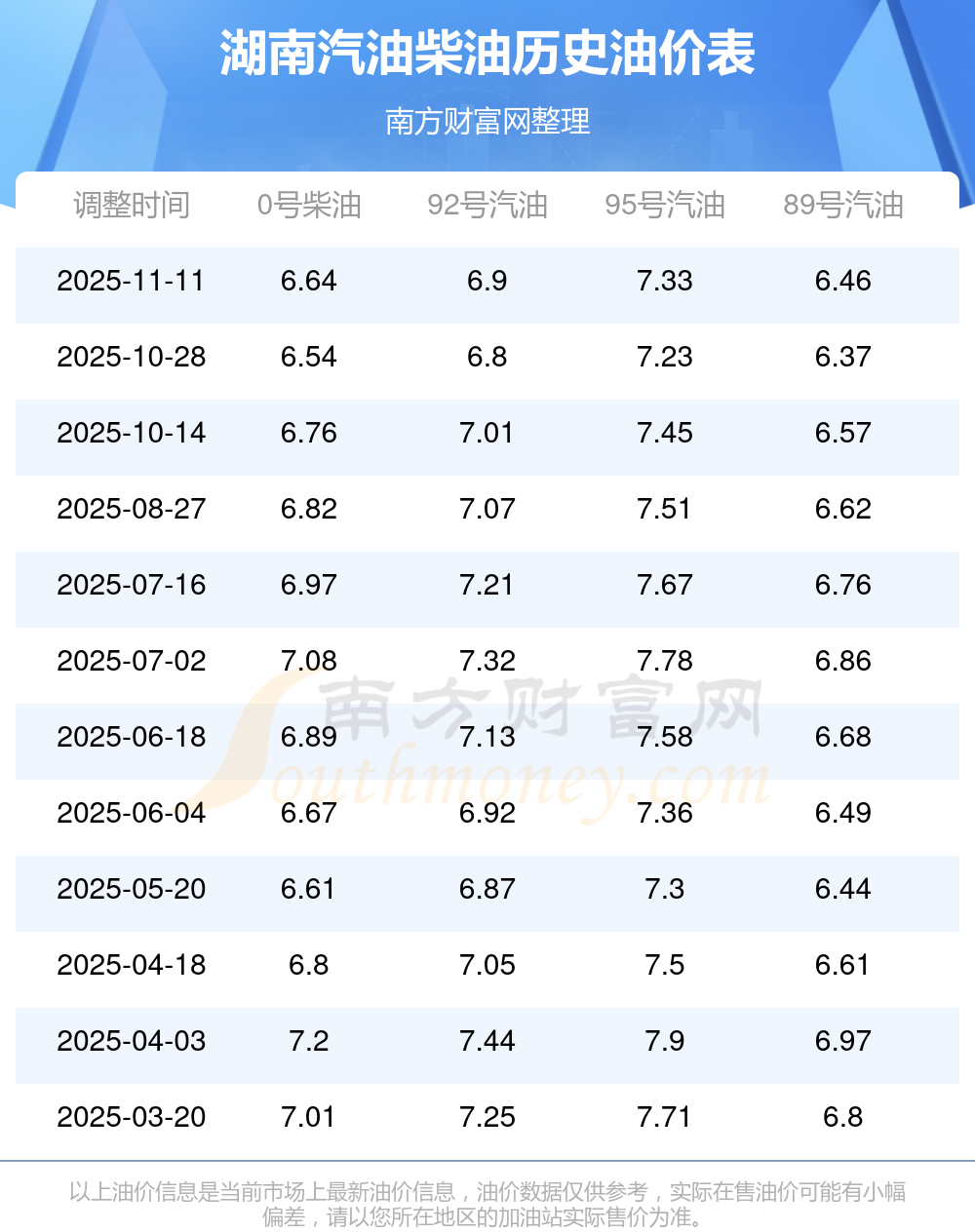 湖南汽油、柴油11月13日每升最新價格多少錢一升?本次油價調(diào)整時間為11月11日,92號汽油為6.9元,升了0.1元;95號汽油為7.33元,升了0.11元;89號汽油為6.46元,升了0.09;0號柴油為6.64元,升了0.1元。