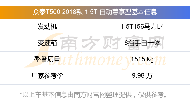 眾泰T500 2018款 1.5T 自動(dòng)尊享型動(dòng)力方面,搭載的是一臺(tái)1.5T156馬力L4渦輪增壓發(fā)動(dòng)機(jī),匹配6擋手自一體自動(dòng)檔變速箱,燃料形式為汽油,常規(guī)整備質(zhì)量1515kg,廠家參考價(jià)9.98萬(wàn)元。