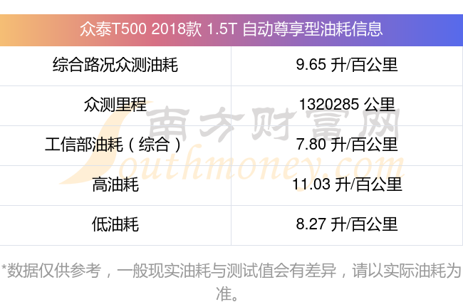 根據(jù)多位車主實(shí)測(cè)得出數(shù)據(jù),該車型低油耗為8.27L/100km,高油耗為11.03L/100km,綜合路況眾測(cè)油耗為9.65L/100km,工信部綜合油耗為7.80L/100km。