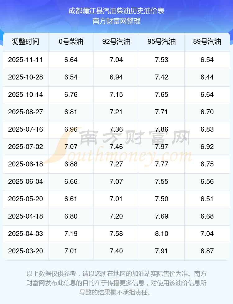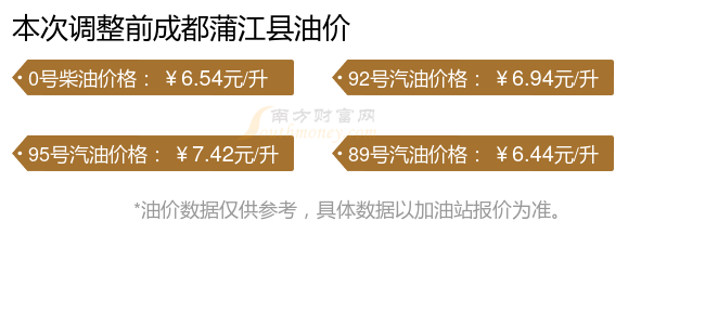 11月13日,成都蒲江縣汽油、柴油每升最新價格為:92號汽油為7.04元,升了0.1元;95號汽油為7.53元,升了0.11元;89號汽油為6.54元,升了0.1元;0號柴油為6.64元,升了0.1元,調(diào)整時間為11月11日。
