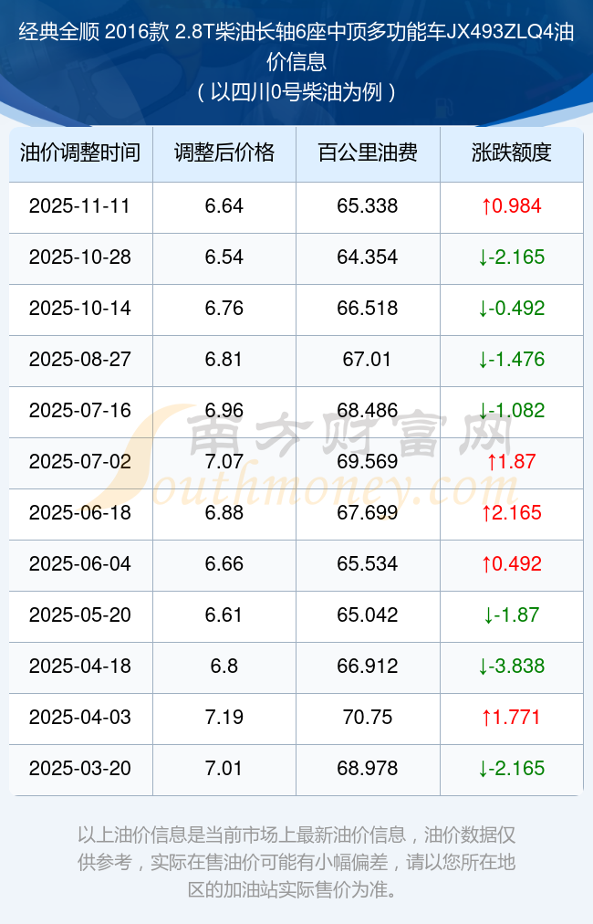 根據11月11日0號柴油最新調整價格6.64元/升來計算(以四川為例),該車型每百公里的平均油費是65.338元,上一輪10月28日調整價格6.54元每升來計算,每百公里的平均油費是64.354元,對比上一輪多花0.984元,下一輪的油價調整時間是11月24日24時。