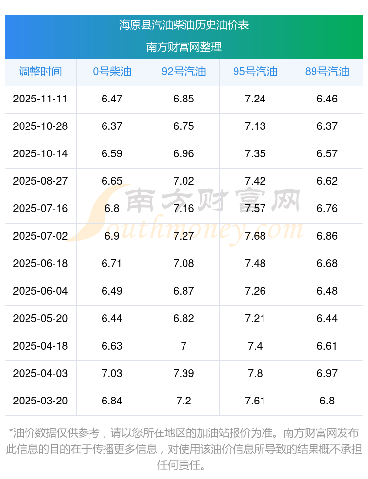 以上數(shù)據(jù)僅供參考,請(qǐng)以您所在地區(qū)的加油站實(shí)際售價(jià)為準(zhǔn)。南方財(cái)富網(wǎng)發(fā)布此信息的目的在于傳播更多信息,對(duì)使用該油價(jià)信息所導(dǎo)致的結(jié)果概不承擔(dān)責(zé)任。
