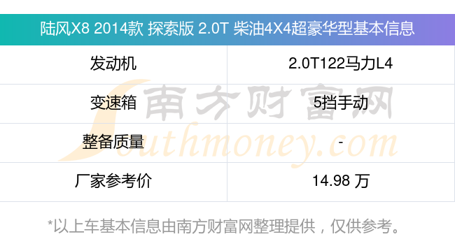 在動(dòng)力上,陸風(fēng)X8 2014款 探索版 2.0T 柴油4X4超豪華型配備的是一臺(tái)2.0T122馬力L4渦輪增壓發(fā)動(dòng)機(jī),匹配的是5擋手動(dòng)擋變速箱,燃料形式為柴油,廠家參考價(jià)14.98萬(wàn)元。