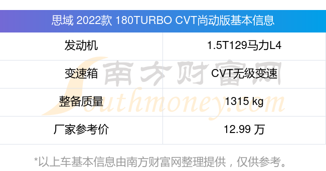 思?? 2022款 180TURBO CVT尚動(dòng)版動(dòng)力上配備的是一臺(tái)1.5T129馬力L4渦輪增壓發(fā)動(dòng)機(jī),匹配的是CVT無級(jí)變速自動(dòng)檔變速箱,燃料形式為汽油,常規(guī)整備質(zhì)量1315kg,廠家參考價(jià)12.99萬元。