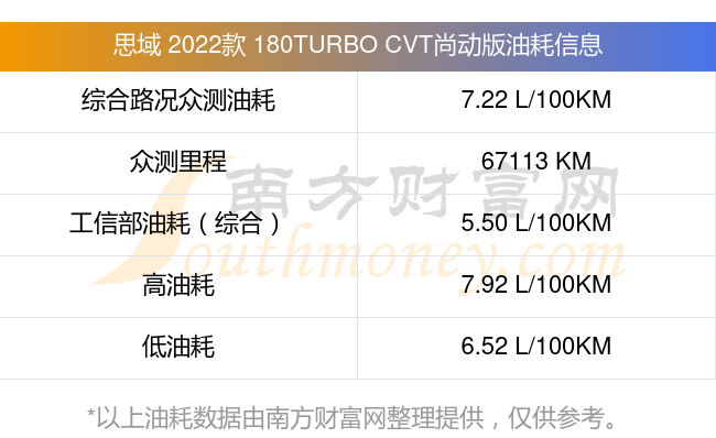 根據(jù)多位車主實(shí)測得出數(shù)據(jù),該車型低油耗為6.52L/100km,高油耗為7.92L/100km,綜合路況眾測油耗為7.22L/100km,工信部綜合油耗為5.50L/100km。