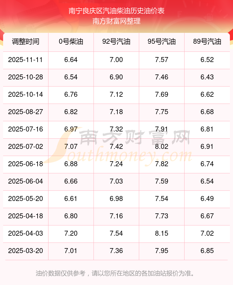 2025年南寧良慶區(qū)油價(jià)調(diào)整時(shí)間表