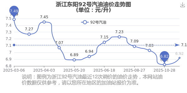 浙江東陽汽油、柴油11月13日每升的價格為(本輪油價調(diào)整時間為11月11日):92號汽油6.92元;95號汽油7.36元;89號汽油6.41元;0號柴油6.57元。浙江東陽下一輪油價調(diào)整時間11月24日24時,距離現(xiàn)在還有11.29天。