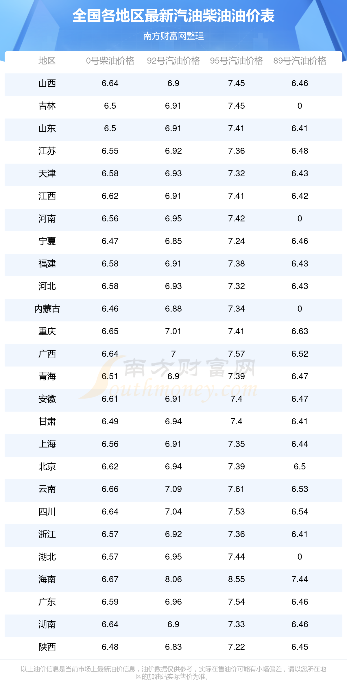 油價(jià)數(shù)據(jù)僅供參考,請(qǐng)以您所在地區(qū)的加油站報(bào)價(jià)為準(zhǔn)。南方財(cái)富網(wǎng)發(fā)布此信息的目的在于傳播更多信息,對(duì)使用該油價(jià)信息所導(dǎo)致的結(jié)果概不承擔(dān)任何責(zé)任。
