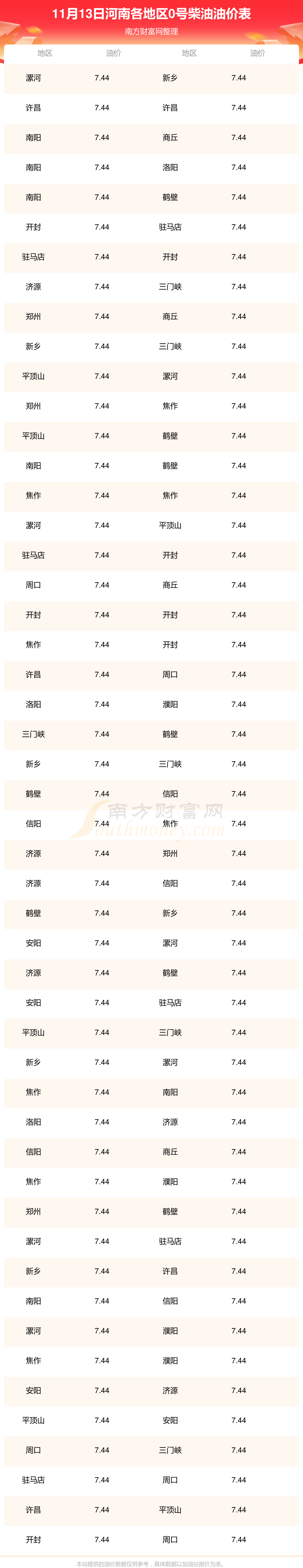 11月13日,河南0號柴油的價格是6.56元每升,本次的調(diào)整時間為11月11日,對比上次的調(diào)整上漲了0.1元,上漲1.548%,下次調(diào)整時間為11月24日24時,還有11.28天。