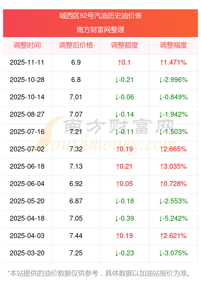 11月13日城西區(qū)92號(hào)汽油價(jià)格:6.9元每升,調(diào)整時(shí)間為11月11日,相對(duì)上次調(diào)整上漲了0.1元。