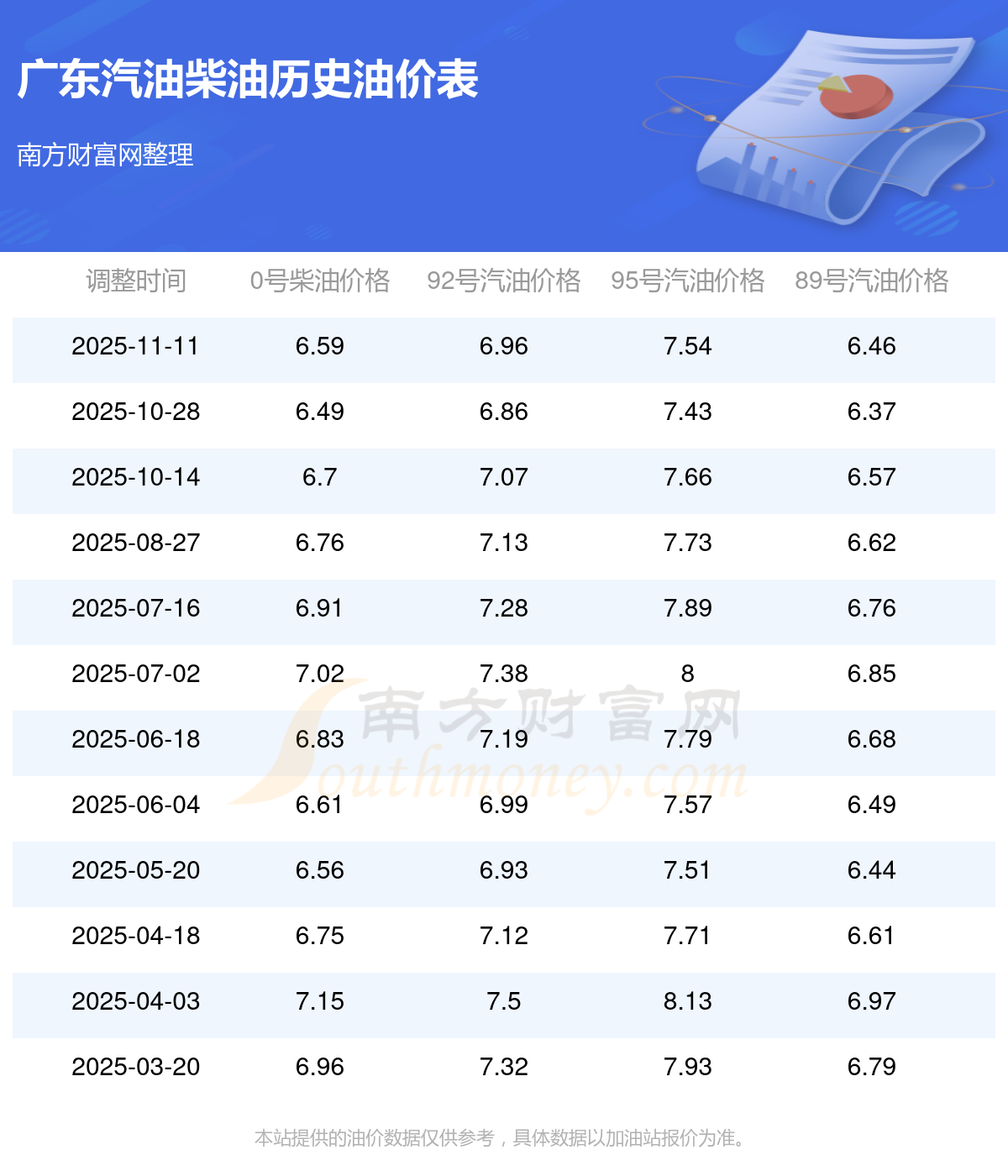 廣東汽油、柴油11月13日每升最新價格查詢:本輪油價調(diào)整時間為11月11日,92號汽油6.96元,升了0.1元;95號汽油7.54元,升了0.11元;89號汽油6.46元,升了0.09;0號柴油6.59元,升了0.1元。