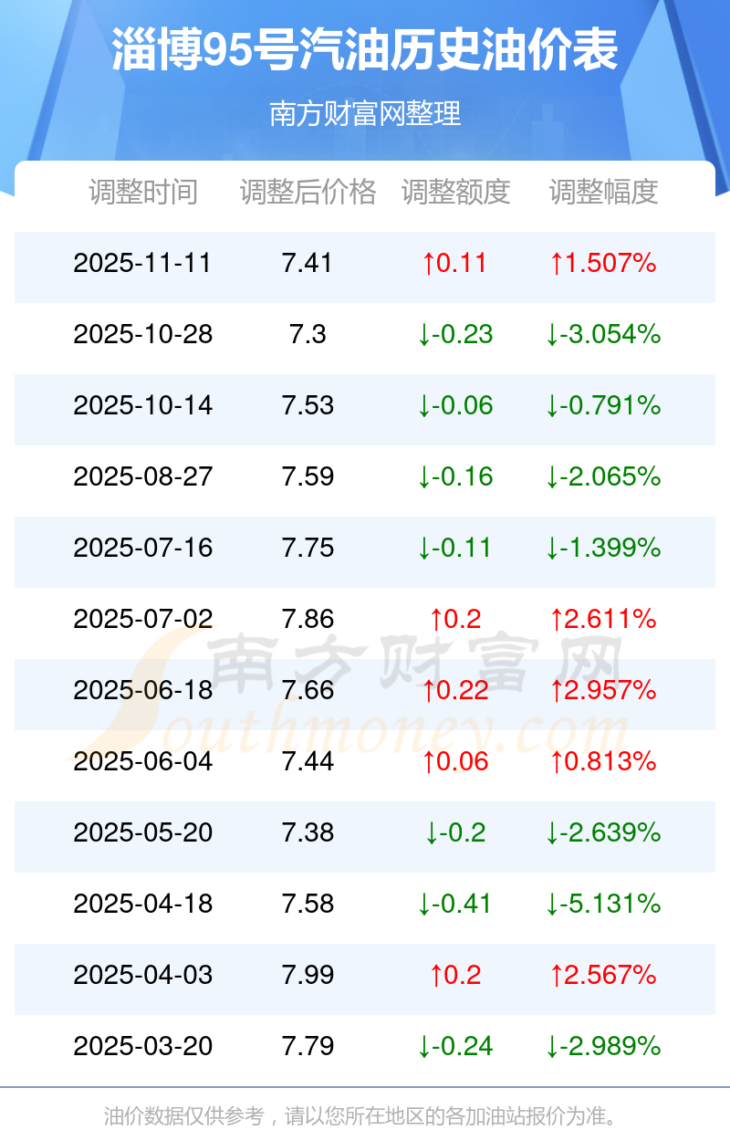 淄博95號汽油11月13日價格(11月11日調(diào)整后的價格):7.41元每升,對比上次調(diào)整(10月28日)的價格7.3元每升上升了0.11元,上升幅達1.507%。下一輪油價調(diào)整時間11月24日24時,距離現(xiàn)在還有11.26天。