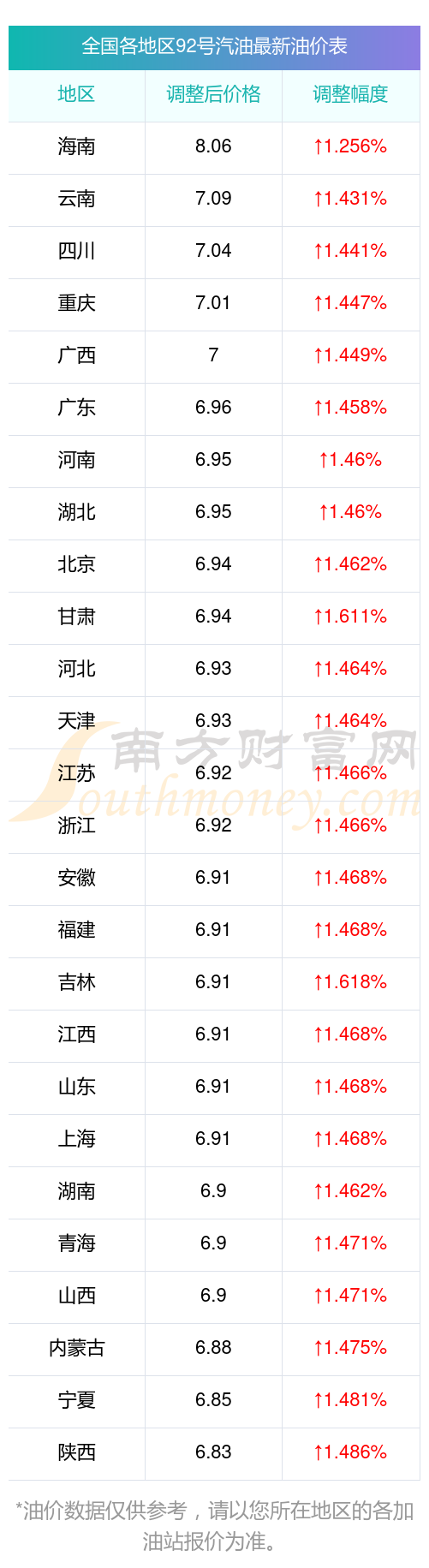 全國92號汽油平均價格為:7元每升,其中,最低為陜西,價格6.83元/升,最高為海南,價格8.06元/升。