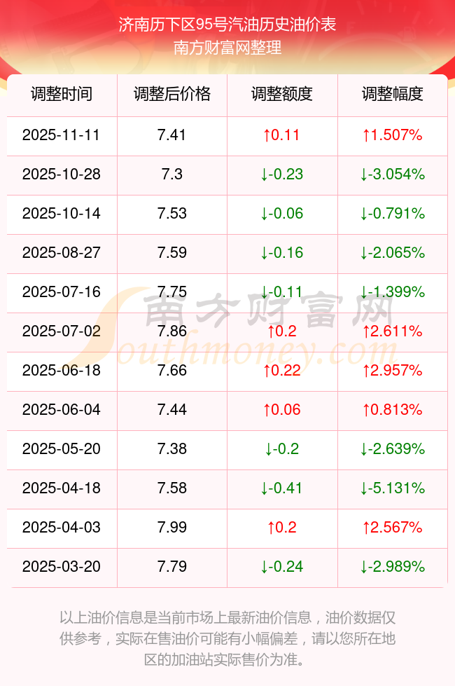 濟南歷下區(qū)95號汽油歷史油價一覽表