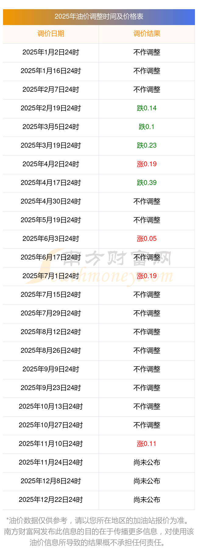 油價調(diào)整最新消息:下一輪油價調(diào)整時間11月24日24時。長春公主嶺市汽油、柴油11月13日每升的價格是多少?具體為:92號汽油為6.91元,升了0.11元;95號汽油為7.45元,升了0.11元;0號柴油為6.5元,升了0.1元,本輪油價的調(diào)整時間為11月11日。