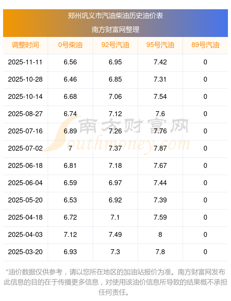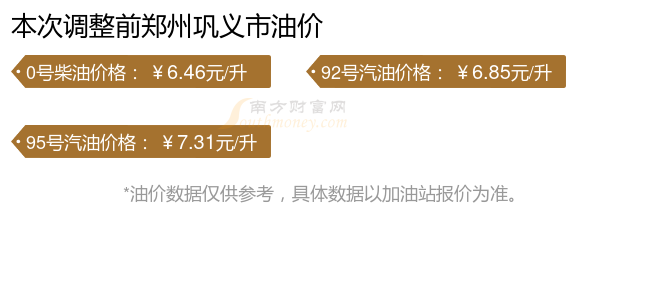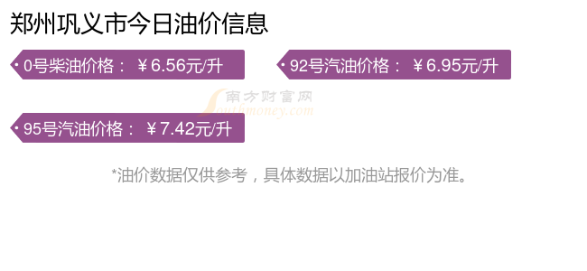 鄭州鞏義市汽油、柴油11月13日每升的價(jià)格為(油價(jià)調(diào)整時(shí)間是11月11日):92號(hào)汽油6.95元;95號(hào)汽油7.42元;0號(hào)柴油6.56元。