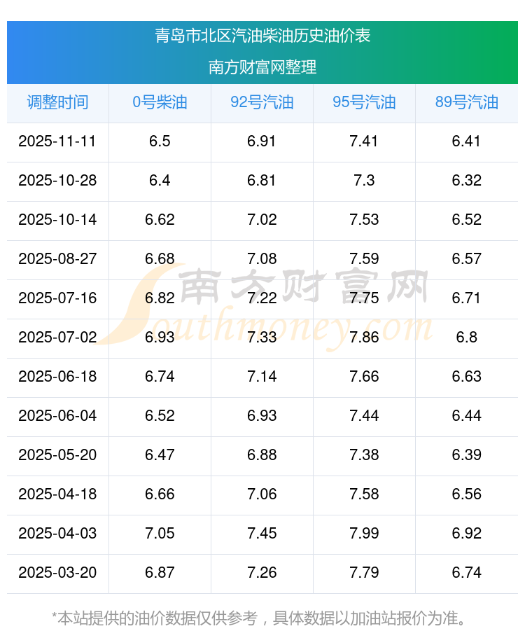 青島市北區(qū)歷史油價(jià)表
