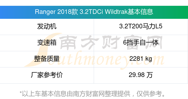 Ranger 2018款 3.2TDCi Wildtrak搭載了一臺3.2T200馬力L5渦輪增壓發(fā)動機,采用6擋手自一體自動檔變速箱,常規(guī)整備質量2281kg,廠家參考價29.98萬元。